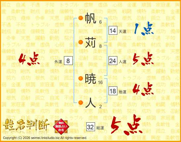 帆苅暁人さんの総運は32画の5点!