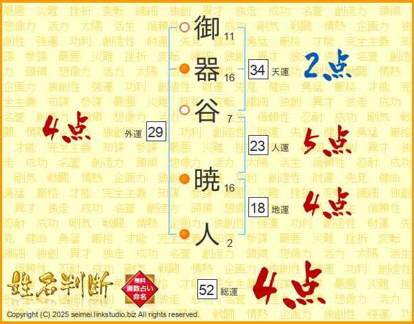 御(11画)器(16画)谷(7画) 暁(16画)人(2画)