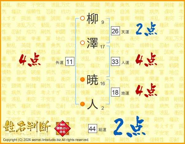 柳澤暁人さんの人運は33画の4点!