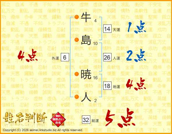 牛島暁人さんの総運は32画の5点!