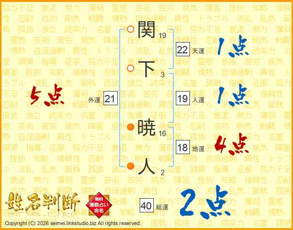 生活面を象徴する運勢です。外部から受ける影響力を表し、結婚運、家庭運や職場、環境への順応性を表します。総運から人運を引いた画数。姓や名が1文字の場合を除く。