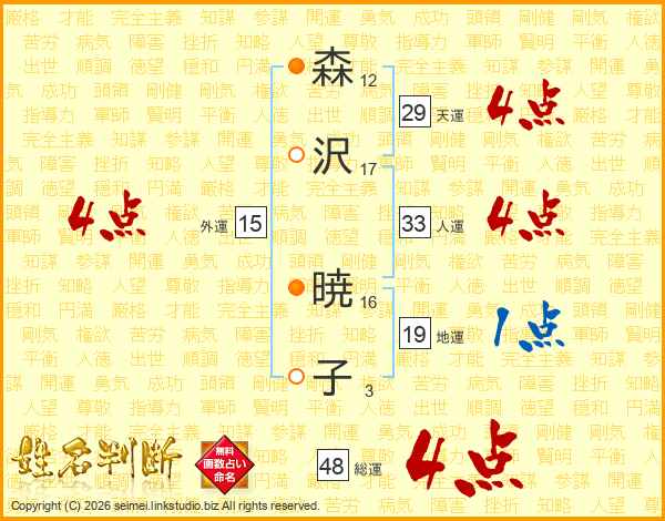あなたの人生を表す1番重要な運勢です。生涯を通じて影響する総合運となり、主に50歳以降の晩年期に影響を及ぼします。苗字と名前の合計画数。