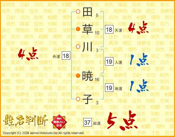 田(5画)草(10画)川(3画) 暁(16画)子(3画)