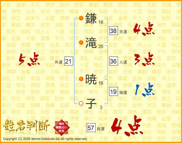 鎌(18画)滝(20画) 暁(16画)子(3画)