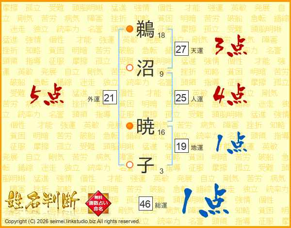 鵜(18画)沼(9画) 暁(16画)子(3画)