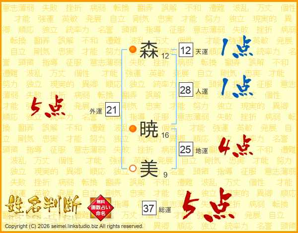 森(12画) 暁(16画)美(9画)