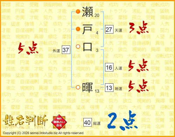 瀬(20画)戸(4画)口(3画) 暉(13画)