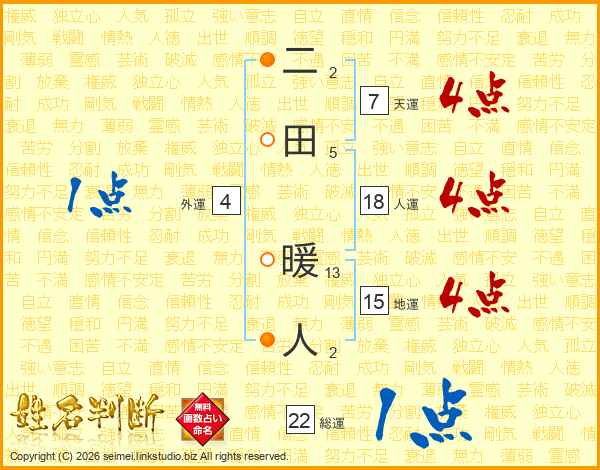 二田暖人さんの人運は18画の4点!