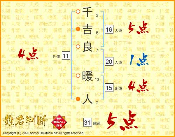 千吉良暖人さんの総運は31画の5点!