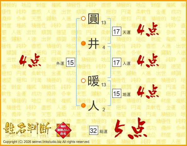 生活面を象徴する運勢です。外部から受ける影響力を表し、結婚運、家庭運や職場、環境への順応性を表します。総運から人運を引いた画数。姓や名が1文字の場合を除く。