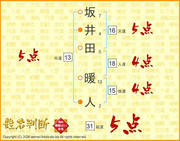 坂井田暖人さんの総運は31画の5点!