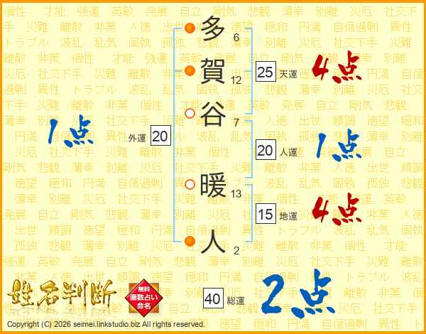 多賀谷暖人さんの総運は40画の2点!