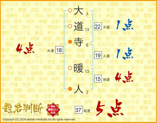 あなたの人生を表す1番重要な運勢です。生涯を通じて影響する総合運となり、主に50歳以降の晩年期に影響を及ぼします。苗字と名前の合計画数。