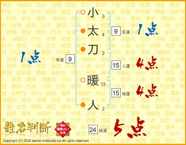 小太刀暖人さんの総運は24画の5点!