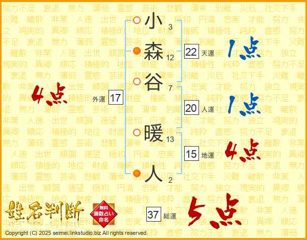 小(3画)森(12画)谷(7画) 暖(13画)人(2画)