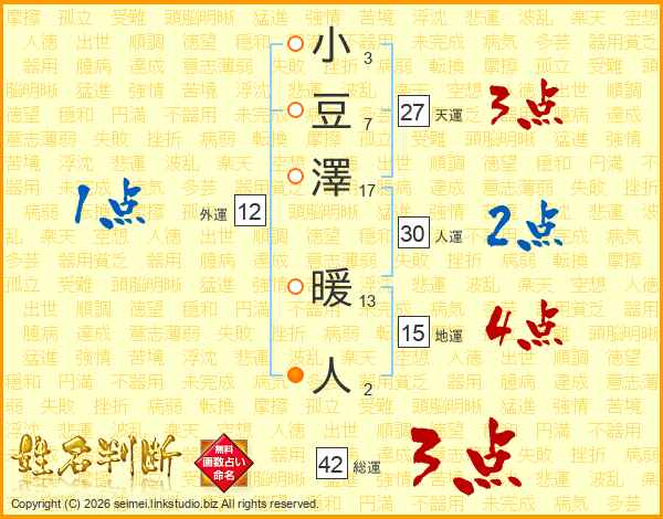 小豆澤暖人さんの総運は42画の3点!