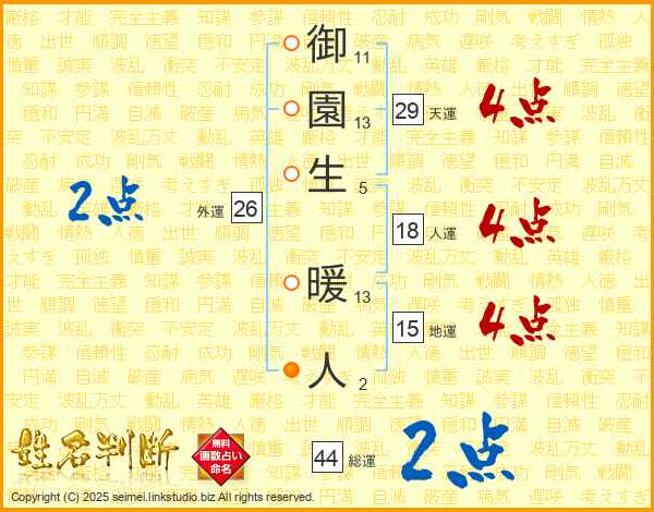 御(11画)園(13画)生(5画) 暖(13画)人(2画)