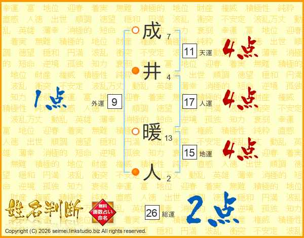 生活面を象徴する運勢です。外部から受ける影響力を表し、結婚運、家庭運や職場、環境への順応性を表します。総運から人運を引いた画数。姓や名が1文字の場合を除く。