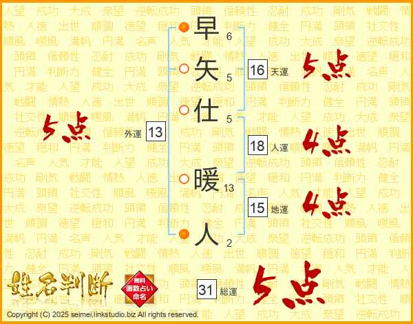 早(6画)矢(5画)仕(5画) 暖(13画)人(2画)