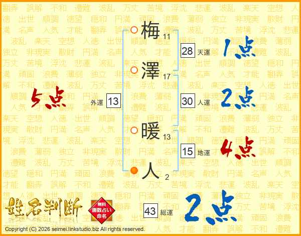 梅(11画)澤(17画) 暖(13画)人(2画)
