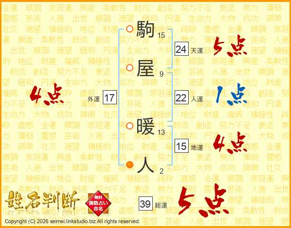 駒(15画)屋(9画) 暖(13画)人(2画)
