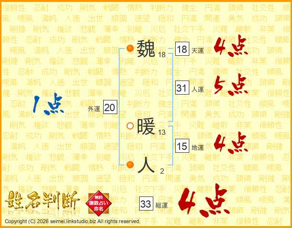 魏暖人さんの総運は33画の4点!