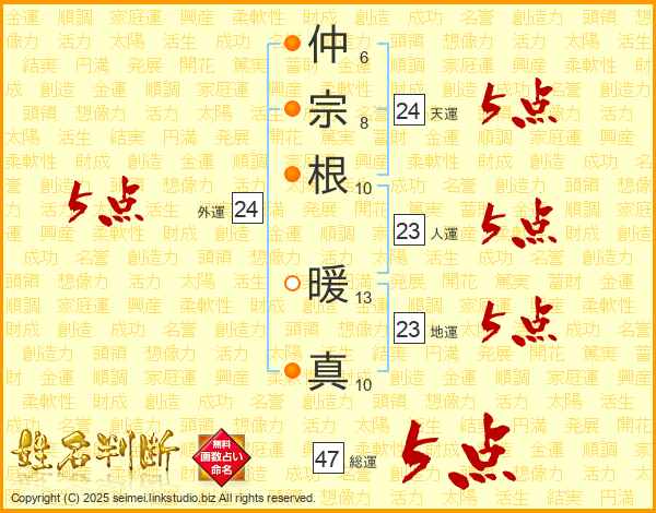 仲(6画)宗(8画)根(10画) 暖(13画)真(10画)