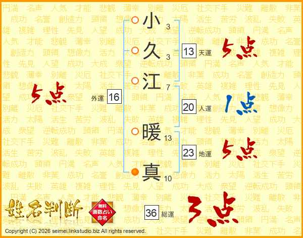 小(3画)久(3画)江(7画) 暖(13画)真(10画)