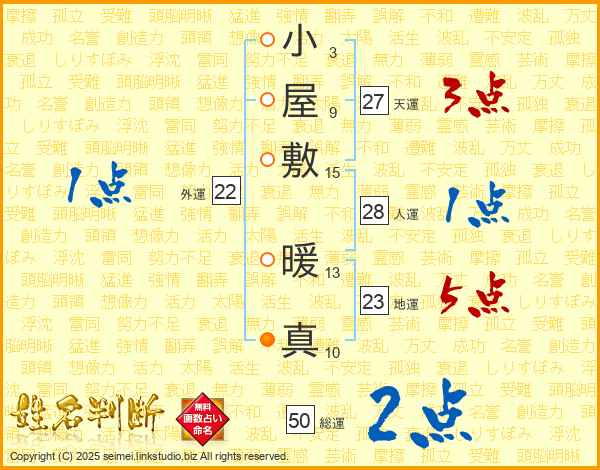 小(3画)屋(9画)敷(15画) 暖(13画)真(10画)