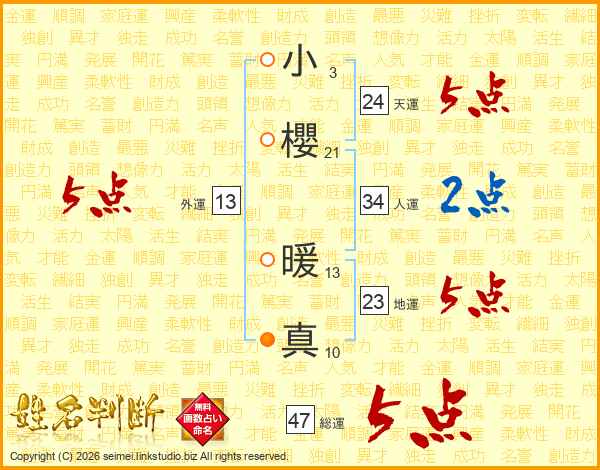小櫻暖真さんの総運は47画の5点!