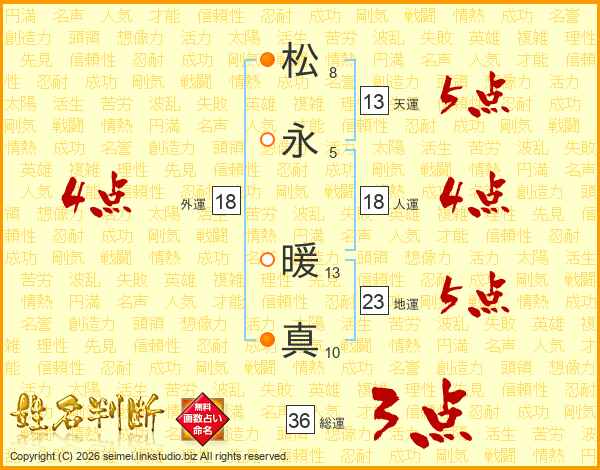 あなたの人生を表す1番重要な運勢です。生涯を通じて影響する総合運となり、主に50歳以降の晩年期に影響を及ぼします。苗字と名前の合計画数。
