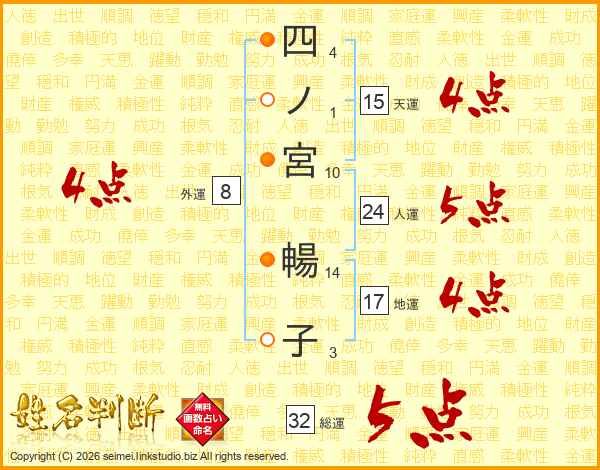 四(4画)ノ(1画)宮(10画) 暢(14画)子(3画)