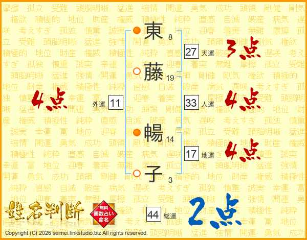 生活面を象徴する運勢です。外部から受ける影響力を表し、結婚運、家庭運や職場、環境への順応性を表します。総運から人運を引いた画数。姓や名が1文字の場合を除く。
