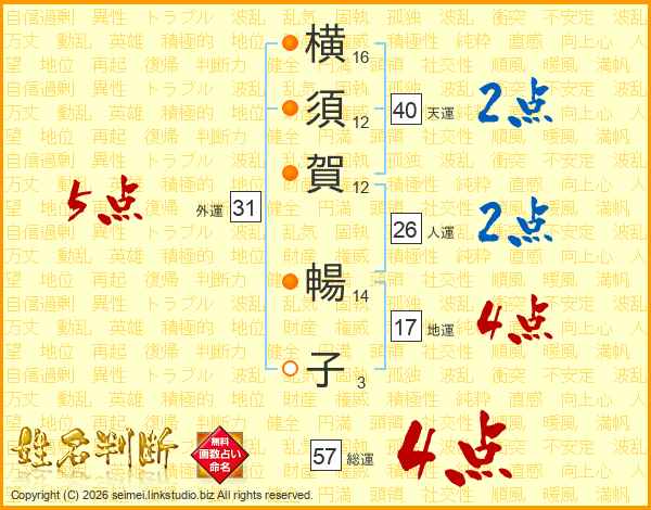 横(16画)須(12画)賀(12画) 暢(14画)子(3画)