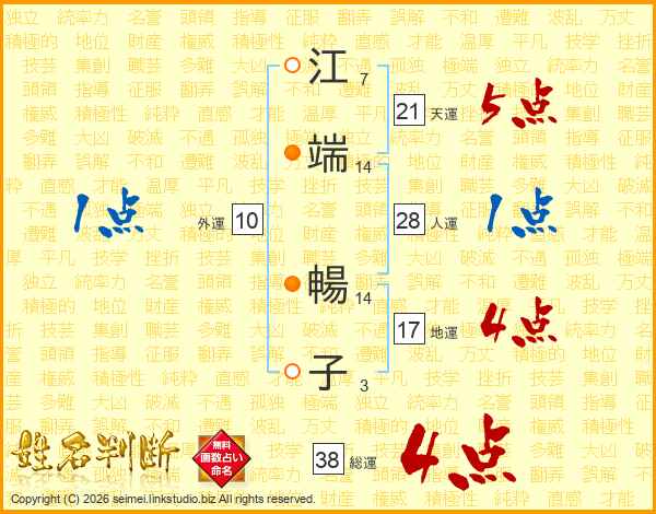 江(7画)端(14画) 暢(14画)子(3画)