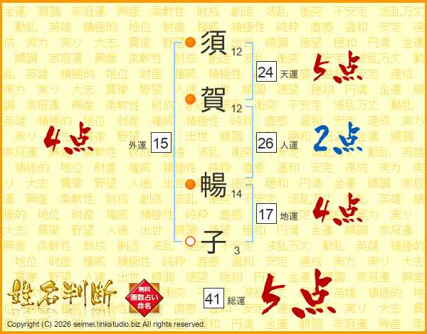 須(12画)賀(12画) 暢(14画)子(3画)