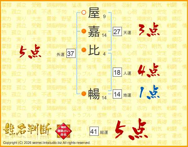 屋(9画)嘉(14画)比(4画) 暢(14画)