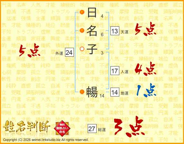 生活面を象徴する運勢です。外部から受ける影響力を表し、結婚運、家庭運や職場、環境への順応性を表します。総運から人運を引いた画数。姓や名が1文字の場合を除く。
