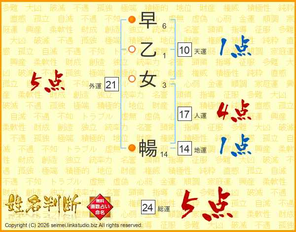 生活面を象徴する運勢です。外部から受ける影響力を表し、結婚運、家庭運や職場、環境への順応性を表します。総運から人運を引いた画数。姓や名が1文字の場合を除く。