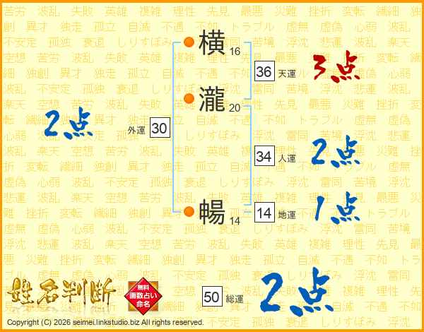 横瀧暢さんの総運は50画の2点!