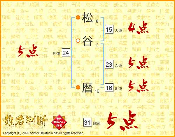 あなたの人生を表す1番重要な運勢です。生涯を通じて影響する総合運となり、主に50歳以降の晩年期に影響を及ぼします。苗字と名前の合計画数。