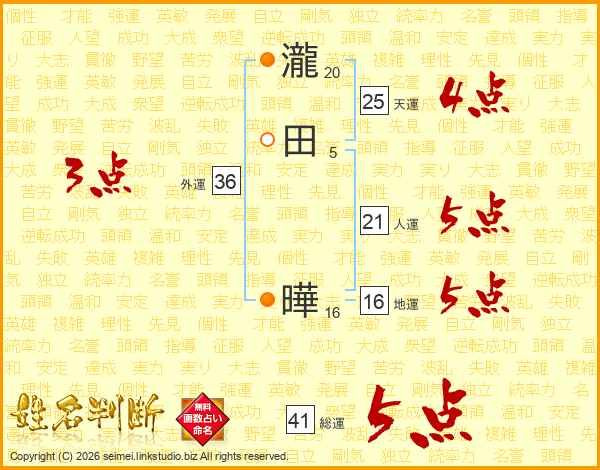家系が持つ宿命的な運勢を表します。祖先から受け継いだ苗字ですので自分の力が及びません。家柄を象徴します。苗字の合計画数。