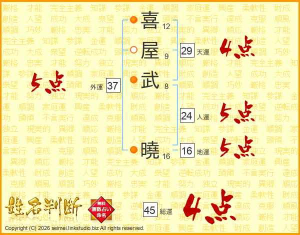 喜(12画)屋(9画)武(8画) 曉(16画)