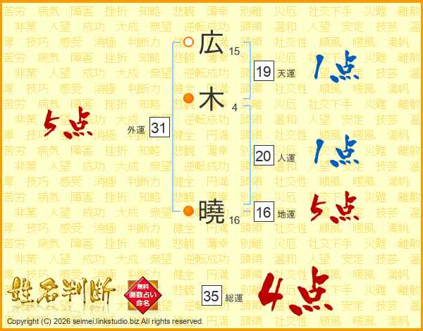 生活面を象徴する運勢です。外部から受ける影響力を表し、結婚運、家庭運や職場、環境への順応性を表します。総運から人運を引いた画数。姓や名が1文字の場合を除く。