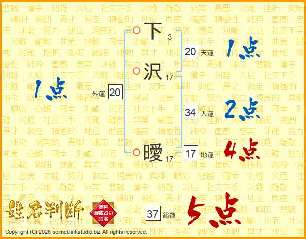 下沢曖さんの総運は37画の5点!