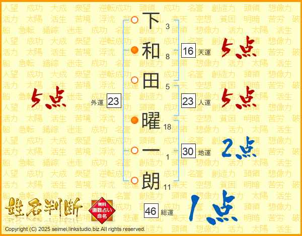 下(3画)和(8画)田(5画) 曜(18画)一(1画)朗(11画)
