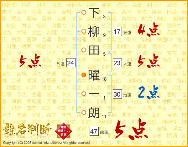下(3画)柳(9画)田(5画) 曜(18画)一(1画)朗(11画)