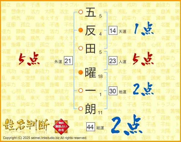 生活面を象徴する運勢です。外部から受ける影響力を表し、結婚運、家庭運や職場、環境への順応性を表します。総運から人運を引いた画数。姓や名が1文字の場合を除く。