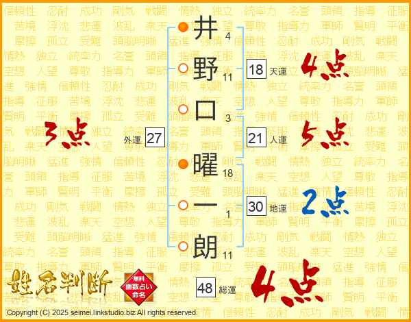 井(4画)野(11画)口(3画) 曜(18画)一(1画)朗(11画)