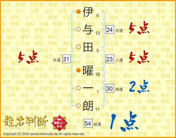 伊(6画)与(13画)田(5画) 曜(18画)一(1画)朗(11画)